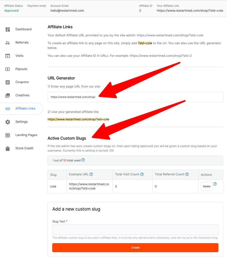 On this page, you can generate your own links or create your own custom slug if you don’t like the link name our system auto-generates for you.