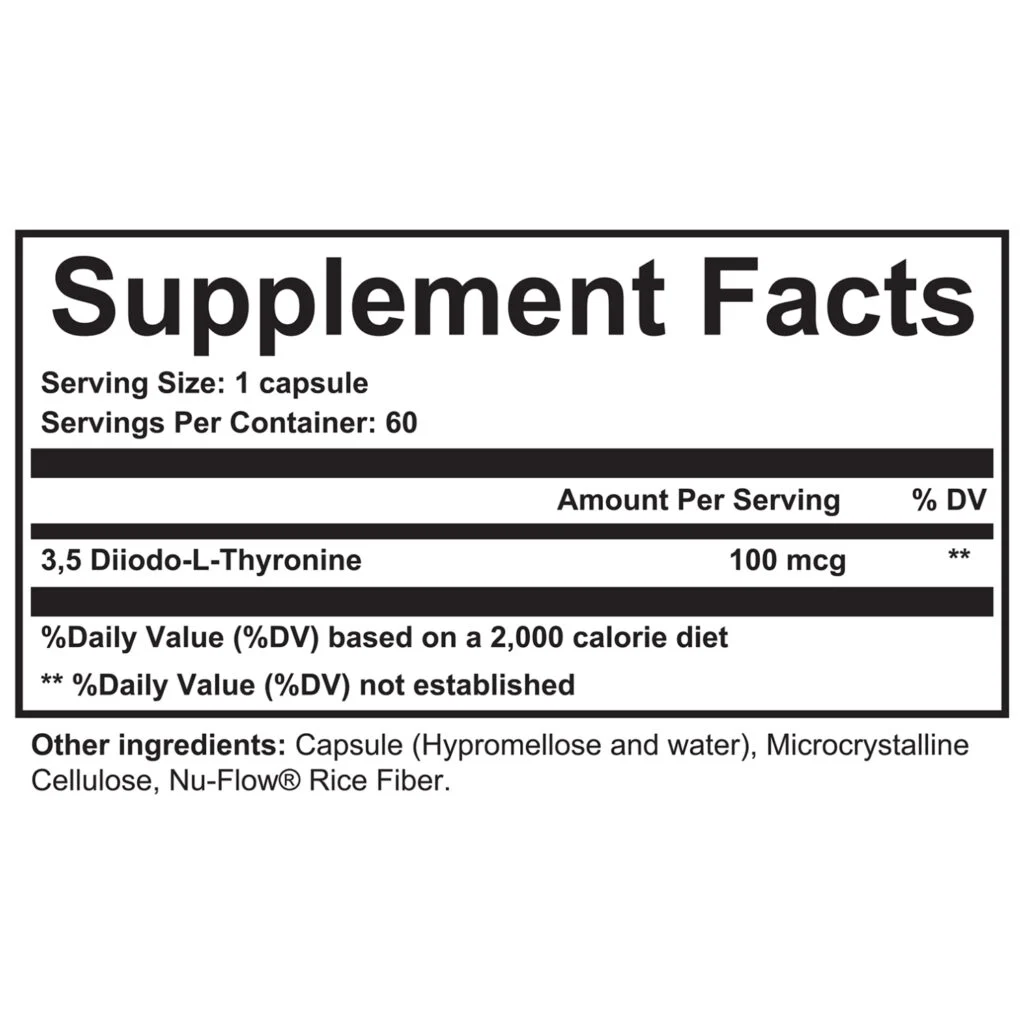 Aside from the active ingredient (3,5 Diiodo-L-Thyronine), Essential T2 contains hypromellose, microcrystalline cellulose, and Nu-Flow Rice Fiber.