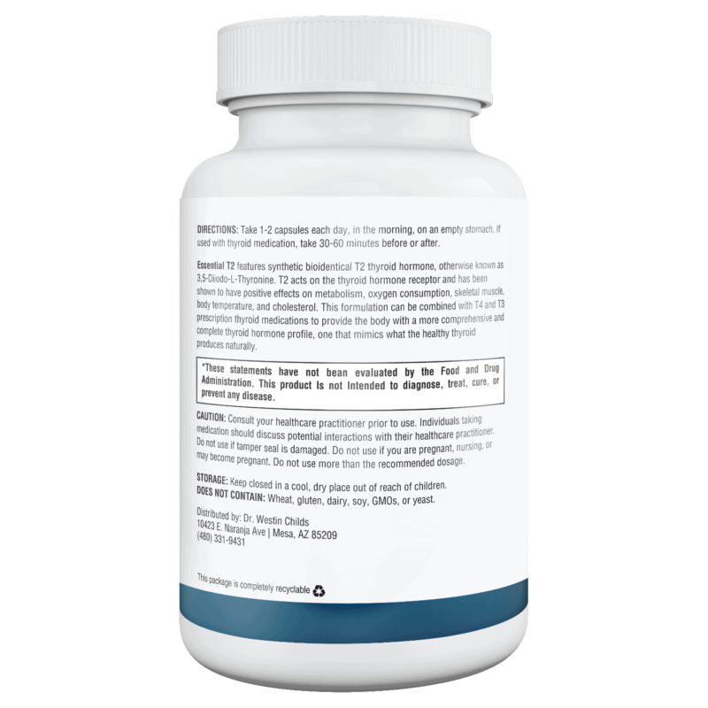Essential T2 contains bioidentical T2 thyroid hormone designed to provide your body with an exact replica of the same T2 thyroid hormone it would create in a healthy state. This supplement can help you create a more comprehensive thyroid hormone replacement regimen, one that mimics what the body produces naturally. Each capsule provides 100mcg of 3,5 Diiodo-L-Thyronine.